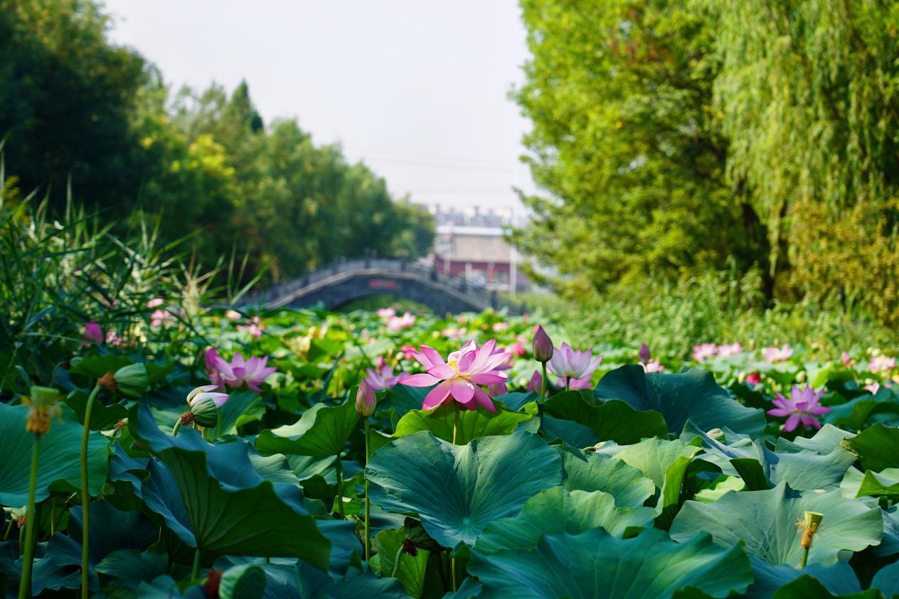 步入园内荷塘,荷叶层层叠叠,宛如一张巨大的绿色绒毯铺展在水面。粉嫩与洁白的荷花星星点点地镶嵌其中,姿态万千。