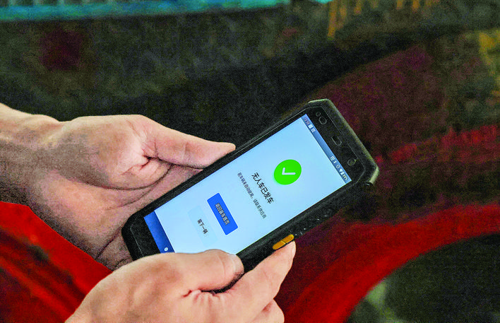 图④ 工作人员在手机客户端点击发车。(金玉敏 摄)