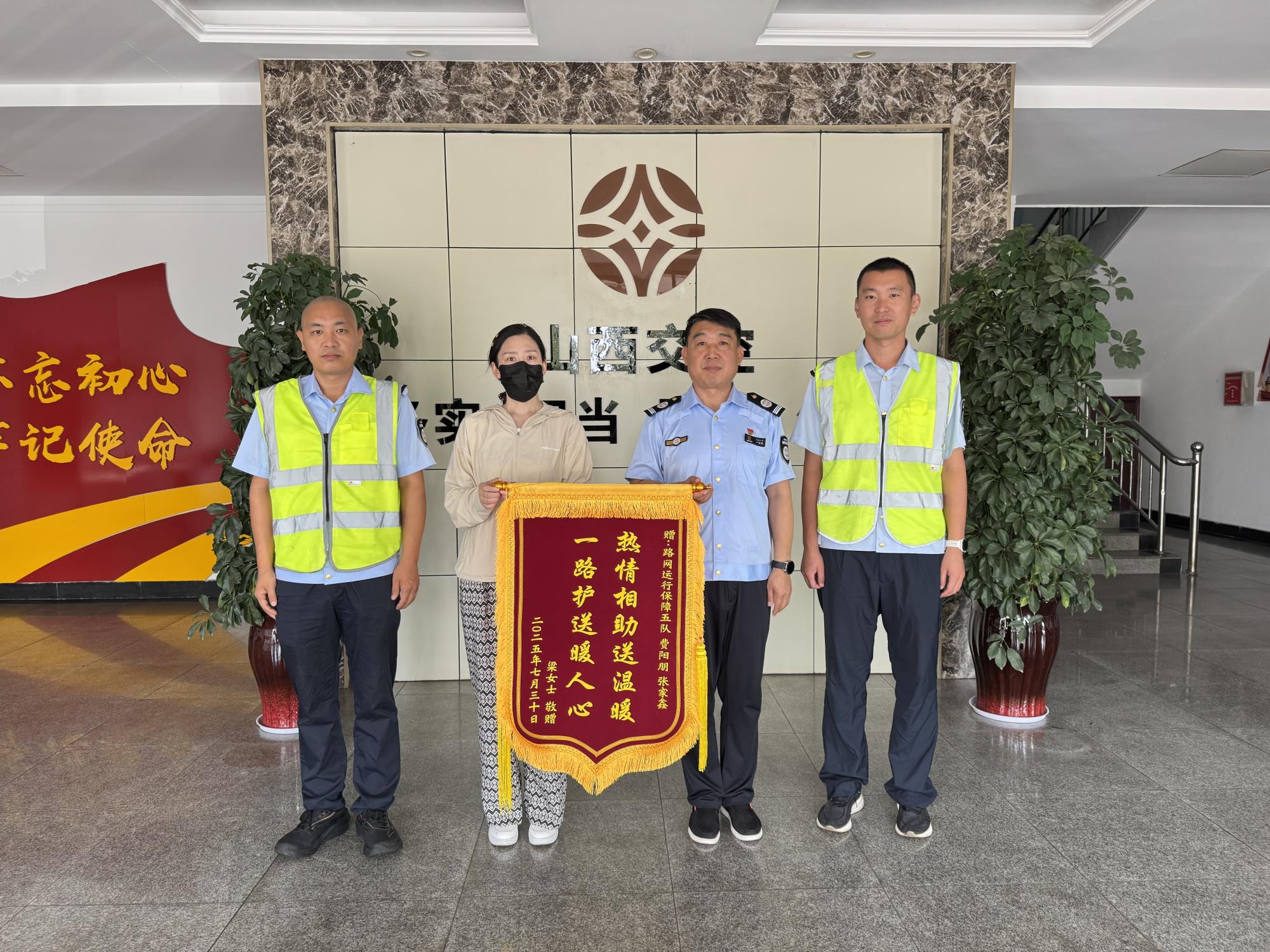 8 月 14 日上午,司机梁女士将一面写着 “热情相助送温暖 一路护送暖人心” 的锦旗送到了运城公司路网运行保障五队办公室。这面锦旗背后,是一段巡查人员紧急救助遇困司机的暖心故事。