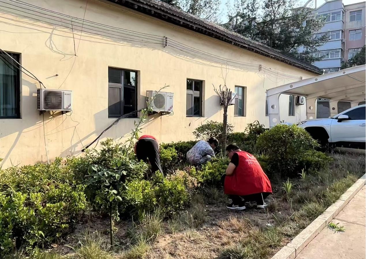 活动当日,党员志愿者身着鲜红马甲,手持扫帚、夹子、簸箕等清洁工具,按照预先划分的区域迅速投入劳动。大家分工明确、配合默契:有的俯身清扫路面落叶与碎石,有的手持夹子深入花园草丛,仔细捡拾塑料袋、纸巾等白色垃圾,还有的负责将垃圾集中清运至指定堆放点。阳光下,红色的身影形成一道亮丽的风景线。