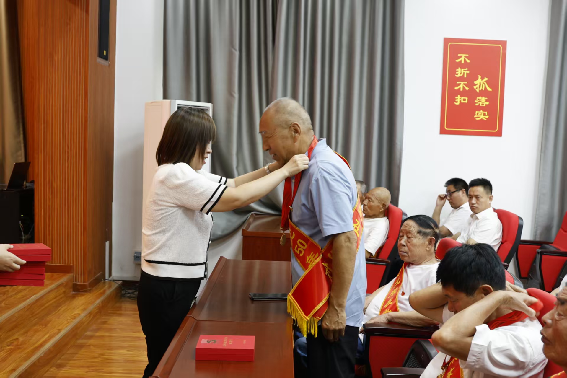 活动伊始,镇党委书记杨靖为党龄满50年的老党员颁发“光荣在党50年”纪念章。老党员们抚摸纪念章,激动之情溢于言表。杨靖表示:“老党员是党的宝贵财富,他们的奉献精神将激励全镇上下接续奋斗。”