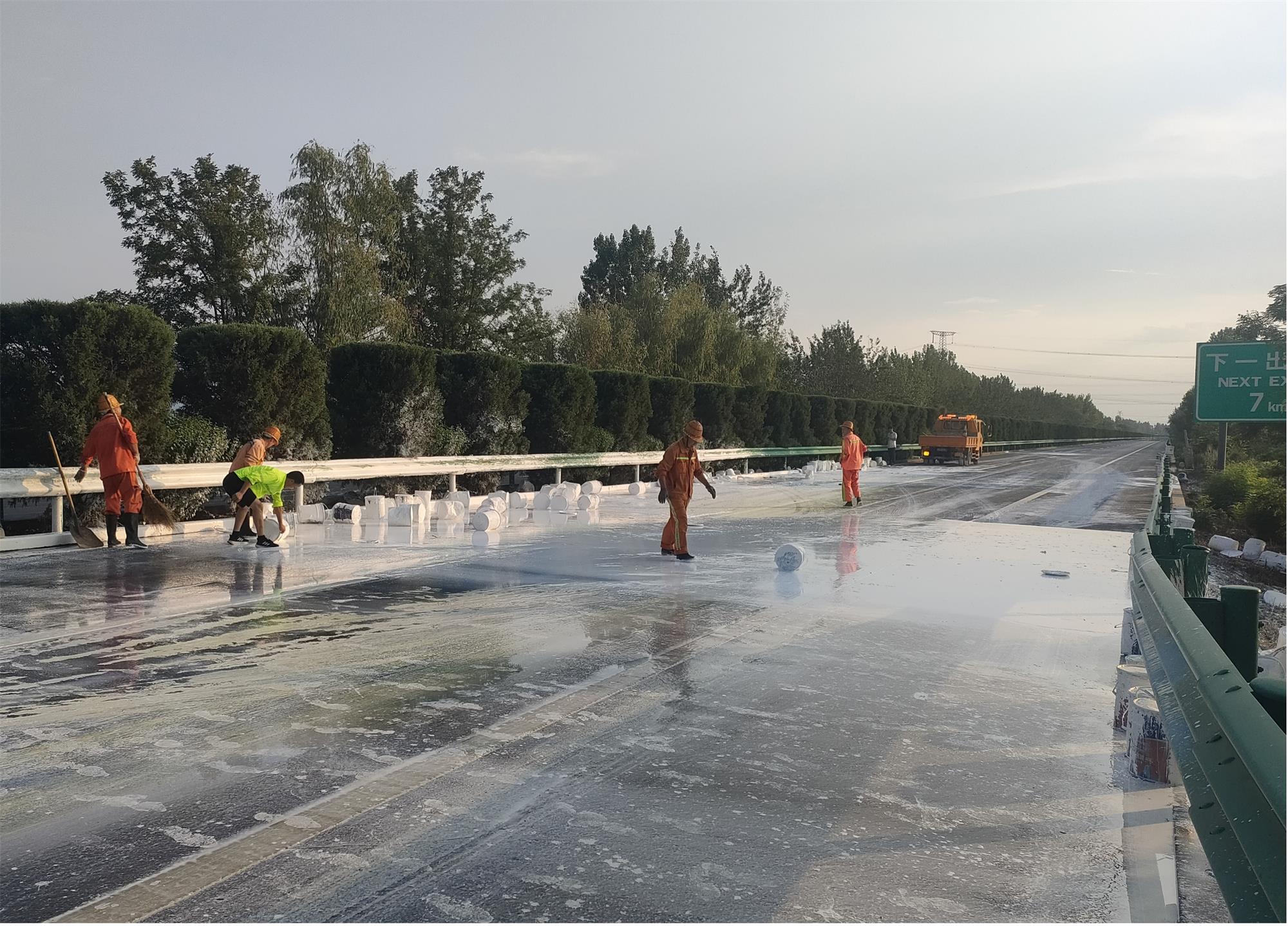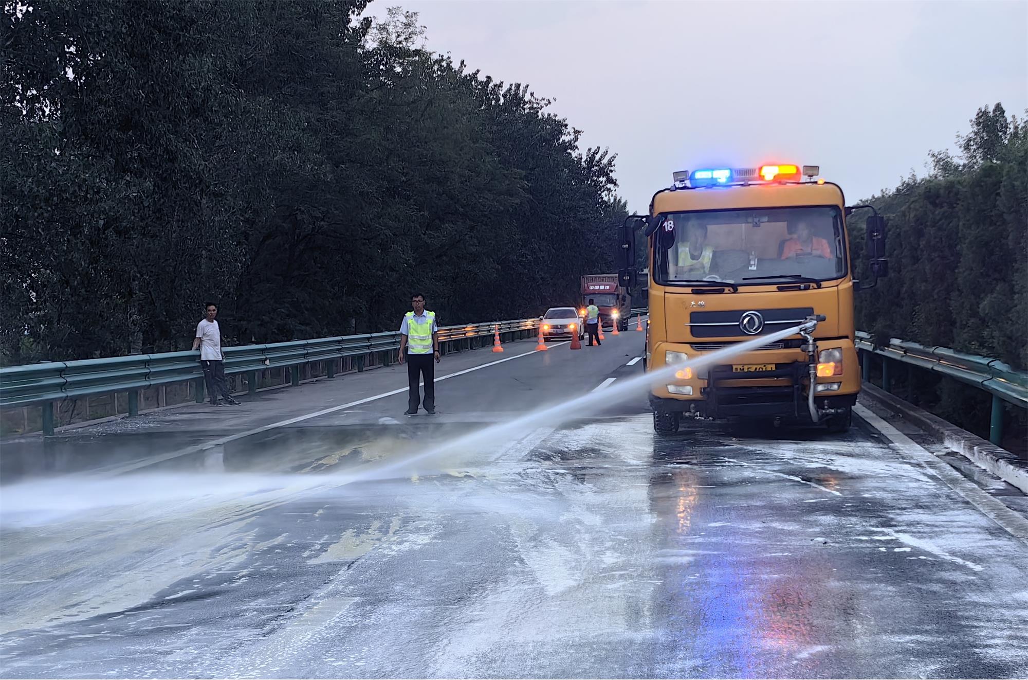 事故发生后,山西交控运城公司养护、路网运行保障等单位闻警即动,“一路三方”联动机制瞬间激活。高速交警与路网运行保障队第一时间拉起警戒线,疏导车流、管控现场,筑起安全屏障;养护人员带着工具火速赶到现场,先通过人工作业一点点剥离凝固的乳胶漆,再架起高压水枪对污染路面进行反复冲刷,水柱冲击下的泡沫混着残渍顺流而下。经过四小时连续攻坚,20时55分左右,最后一块污渍被彻底清除,事故车辆被拖离现场,道路重新恢复正常通行。