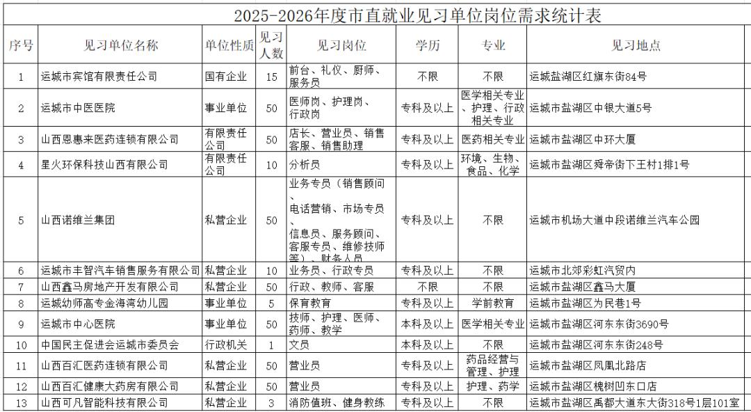 此外,2025 年运城市市本级就业见习单位名单已公布,相关岗位需求详情可参考附件《2025—2026 年度市直就业见习单位岗位需求统计表.xlsx》。