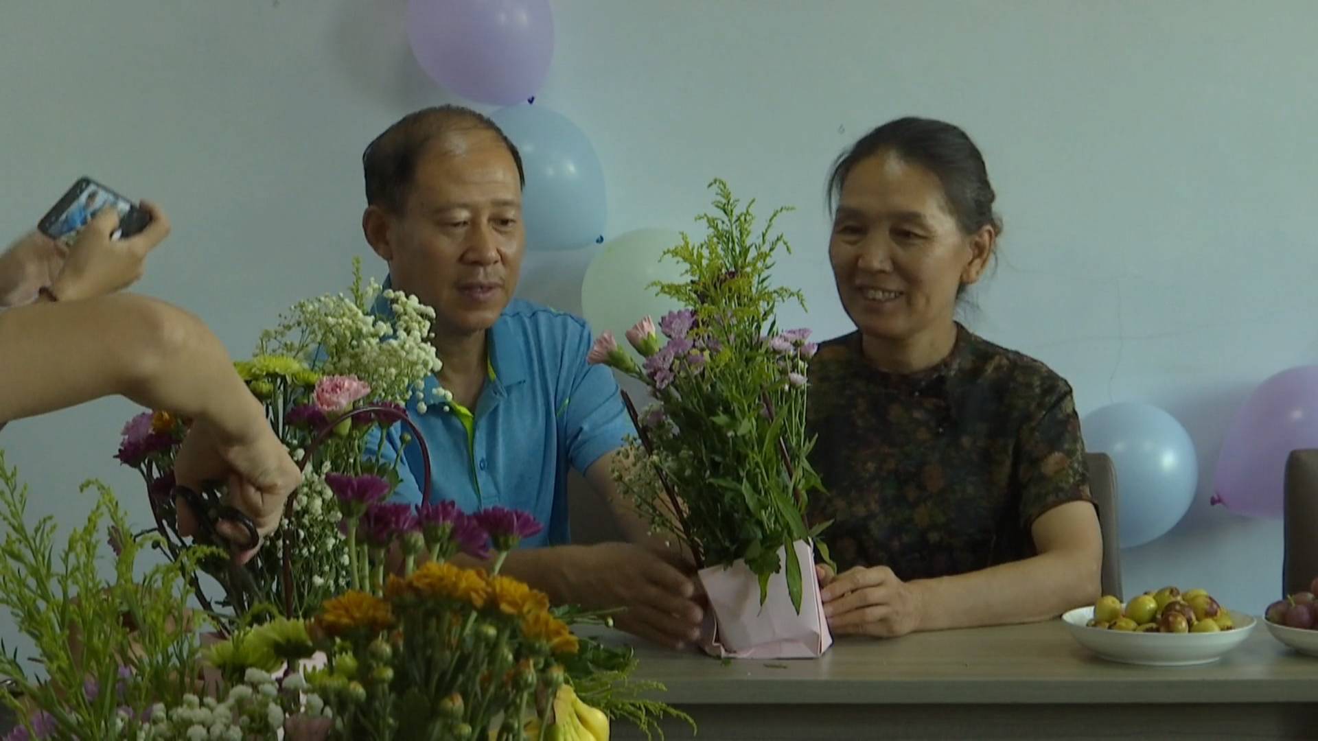 最后,夫妻携手制作永生花团扇,共同构思搭配、分工协作,完成精美的作品。拿着团扇,老同志们笑容幸福,重温爱情与陪伴的温暖。