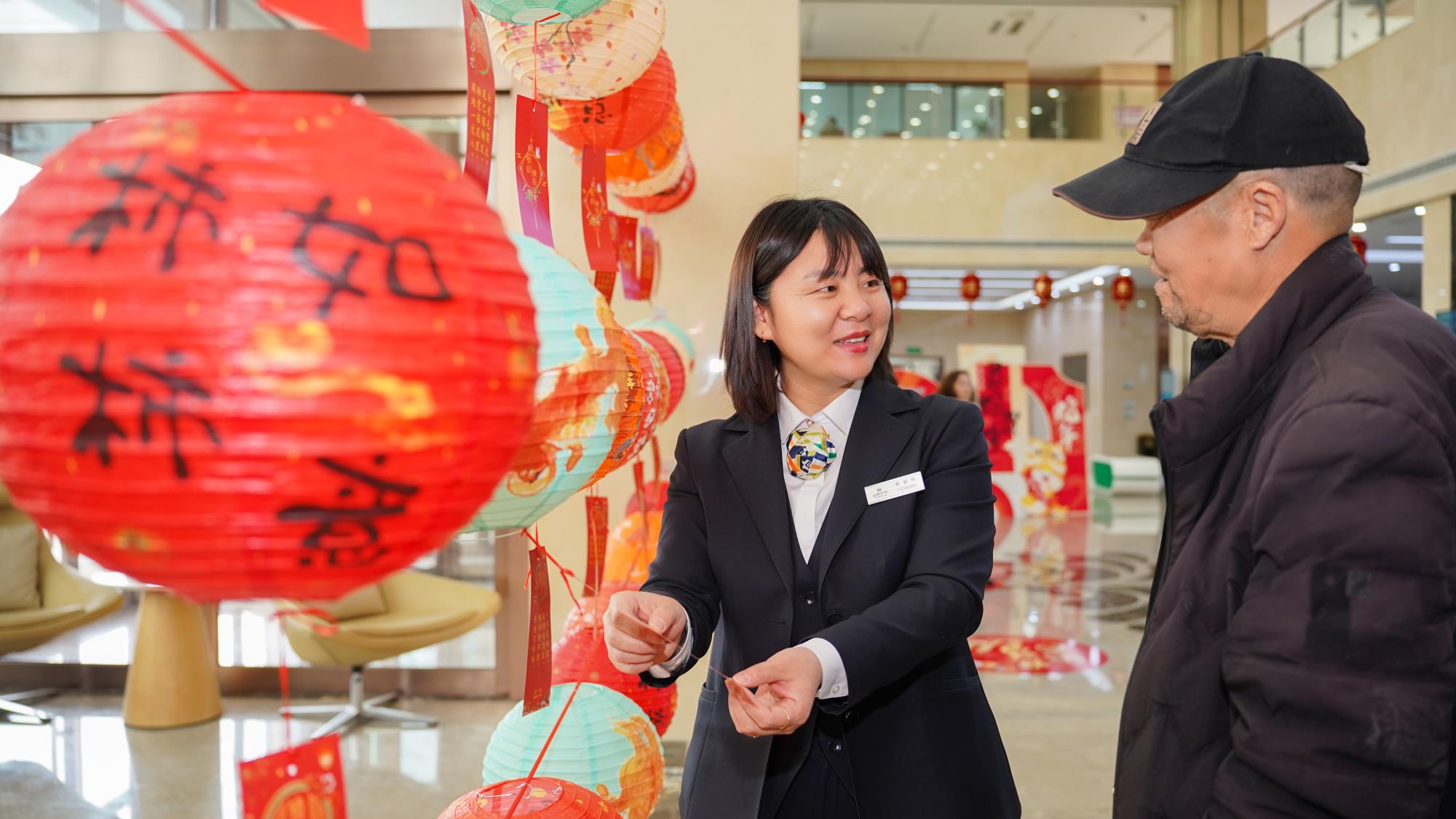 在营业部大厅,一排排五彩斑斓的灯笼高高挂起,每个灯笼下都悬挂着一条精心准备的灯谜。客户们积极参与,或独自思考,或三五成群讨论,现场欢声笑语,热闹非凡。猜灯谜活动不仅增添了节日的乐趣,还让客户在轻松愉快的氛围中增长了知识。