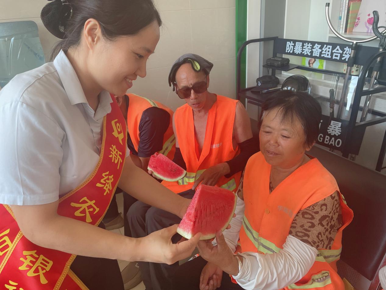 新绛农商银行柳泉支行位于 108 国道边、新桥口附近,因特殊的地理位置,这里成了附近环卫工人心中最贴心的驿站。又一个 40℃的高温天气,该支行特意为前来驿站休息的环卫工人精心准备了消暑的西瓜、小零食和解渴的矿泉水。“这几天室外温度太高,大家要是感觉不适或者需要休息,就来咱这驿站里避暑歇个脚,一定要照顾好自己的身体,小心别中暑啊。咱们周边环境如此干净整洁,全靠你们呢!”