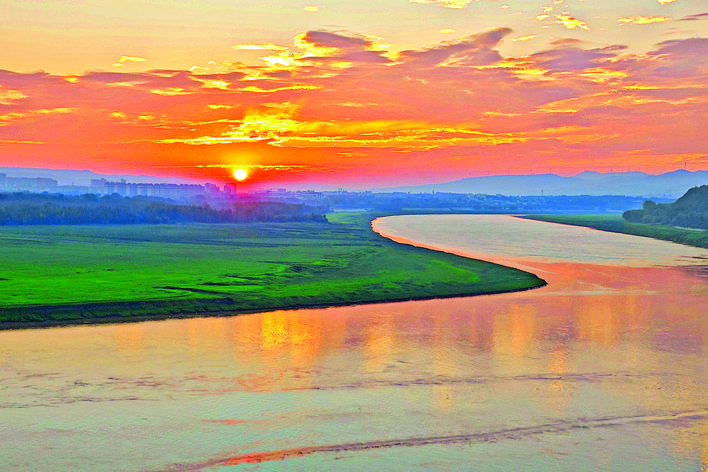 天刚破晓,平陆县城东方的云层随晨光渐亮,次第变红,转瞬红霞铺满天际,黄河水面被霞光浸染,火红如焰。随着太阳缓缓升起,天边红霞逐渐由浓转淡,化作柔和的黄亮色,构成一幅绝美的秋日画卷。(杨新智)