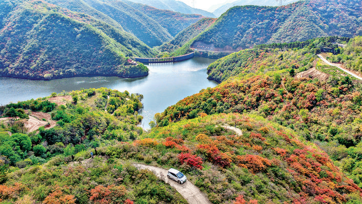 眼下,平陆县大河庙水库秋意正浓,数万亩红叶与粼粼波光交互映衬,构成一幅色彩斑斓的生态图景。(刘文礼 摄)