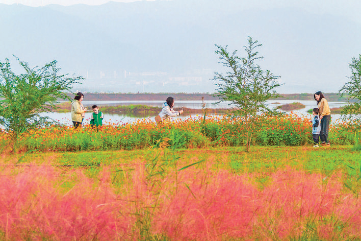 10月13日,游客在运城盐湖景区赏花游玩。运城盐湖景区彩虹路两侧各种盛开的花卉在阳光的映射下显得分外迷人,吸引众多游客前往游玩打卡。(姜 桦 摄)