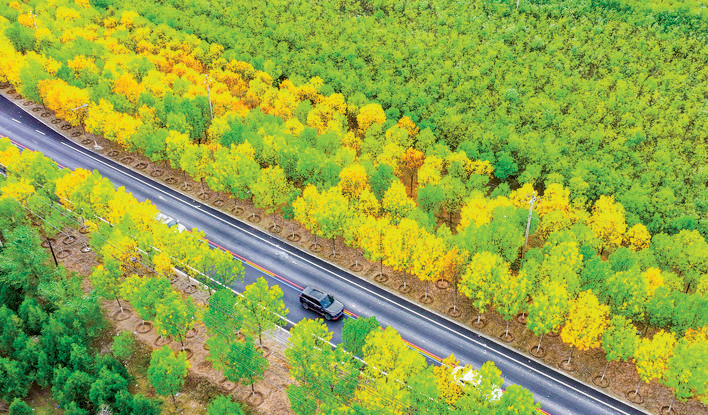 10月21日,汽车驶过中心城区至盐湖区东郭镇道路。秋日的阳光透过疏朗的枝桠,洒在宽阔的彩虹路上,两侧的槐树褪去浓绿,叶片被秋霜染成金黄,像挂起了千万片金箔,呈现出一幅多彩的秋日图景。 特约摄影 姚中吉 摄