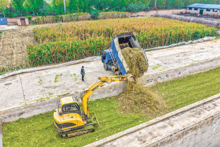 从周边村庄收购的秸秆被投进青贮池中发酵。