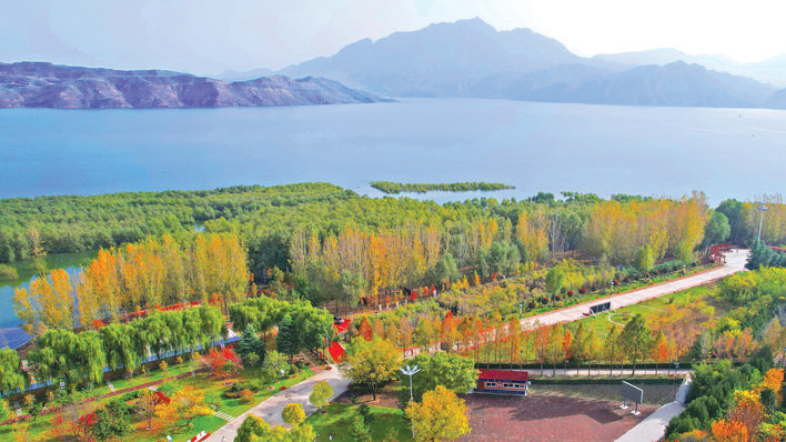 11月12日,垣曲县古城国家黄河湿地,层林尽染,碧水蓝天共一色,初冬环境美如画。