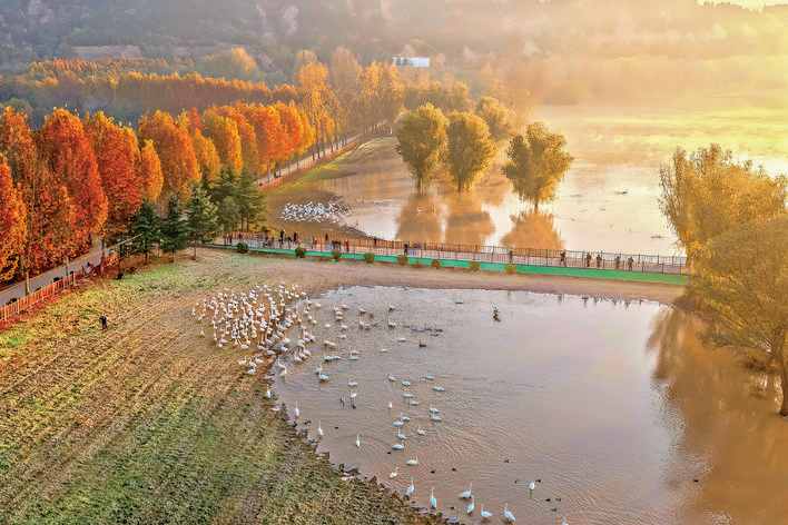 11月13日清晨,平陆县三湾黄河湿地被晨雾轻轻笼罩,如纱似幻,宛若仙境。(杨新智)