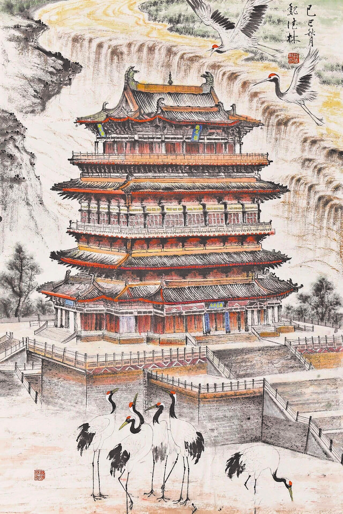 尤为精妙的是,魏德林在画面中巧妙地融入了丹顶鹤的祥瑞意象。它们或展翅高飞,或悠然栖息,为整个画面注入了生机与活力。丹顶鹤不仅是吉祥的象征,更寓意着人们对高远境界的追求,与“欲穷千里目,更上一层楼”的诗句意境相得益彰,进一步升华了作品的文化内核。
