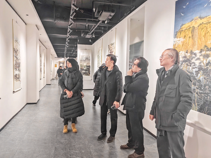 展厅之中,《中条泛舟》《虞坂古盐道》《司马温公祠》《稷山大佛》《禹王台》等作品各具特色、熠熠生辉,笔触间既有写实手法的细腻描摹,又有写意风格的磅礴气势,有的作品精细描绘殿宇飞檐的精巧结构,有的作品纵情挥洒山河古迹的雄浑气魄。艺术家们坚守传统笔墨精髓,又融入创新表达手法,以多元艺术语言构建起立体生动的“河东图景”,让观众仿佛穿行于运城的历史长河与当代烟火之中。夏县美协副主席王丹的工笔重彩《司马温公祠》从构思到完成历时一个月,她精心遴选了具有代表性的杏花碑楼、门楼及涑水书院等元素,将其富有层次地镶嵌在山川的掩映之中,王丹表示:“夏县被誉为运城的后花园,我也想通过作品让更多人了解夏县优美的景色和深厚的人文底蕴,了解既古老又有活力的夏县。”