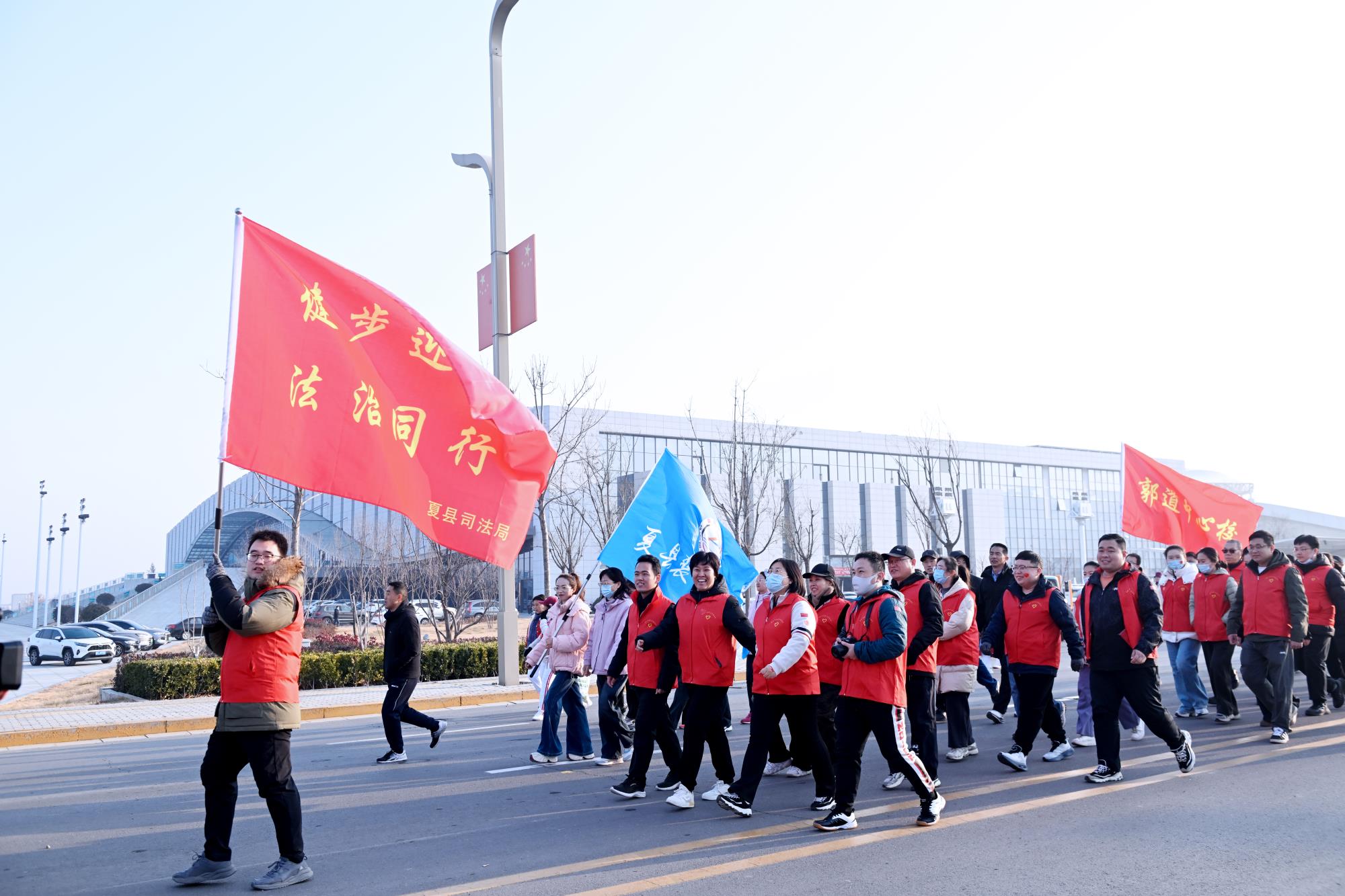本次活动从夏都体育中心广场出发,沿滨河路至康杰南路至禹王东大街、再至温泉路最终到达瑶台山景区广场,全程约5公里。随着发令枪信号一响,健步走队伍如潮水般向前涌动,大家挥舞着旗帜、喊着口号,脚步铿锵有力,连冬日的寒风都挡不住这份扑面而来的热情。