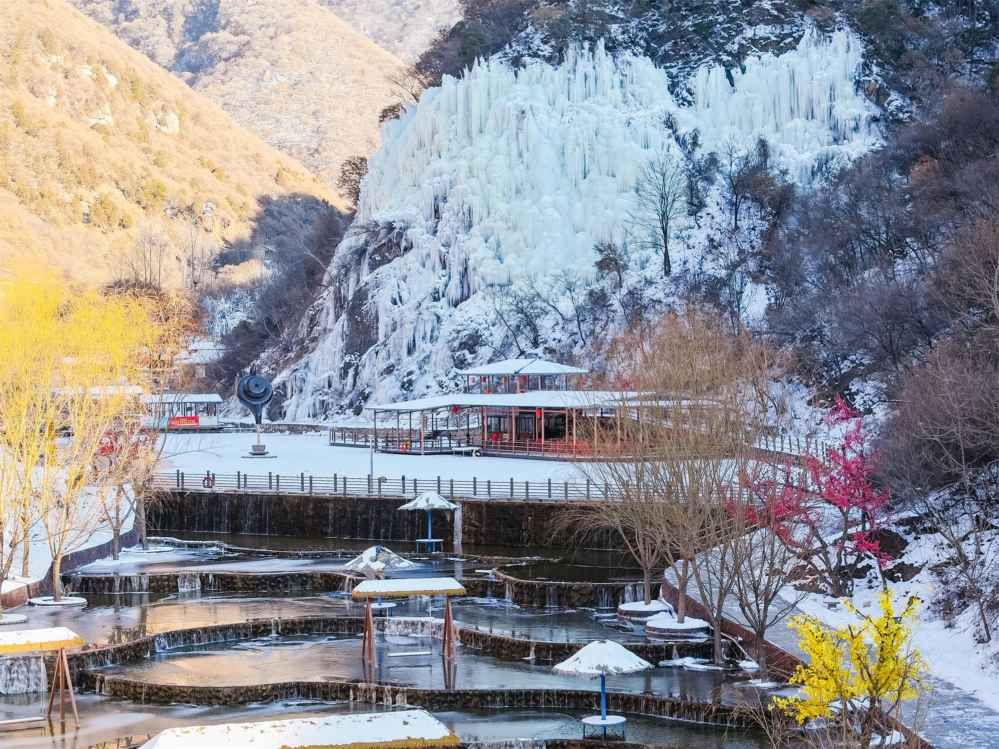 作为晋南规模领先的冰雪娱乐目的地,景区在景观基础上升级了多元体验项目。3万余平方米的冰雪乐园划分成人区与儿童区,涵盖冰雪迷宫、雪地飞碟、雪地坦克、冰上自行车、冰车接力赛等30余种戏雪娱乐项目,新增的七彩滑道、旋转飞椅等亲子设施更让家庭游客尽享欢乐。同步启幕的第六届冰雪节还推出系列特色活动:冰瀑冰挂摄影大赛定格冬日美景,绛县美食节提供免费乳白羊汤等特色风味,正月十五庙会更添民俗氛围,让游客在赏冰戏雪之余感受地域文化魅力。