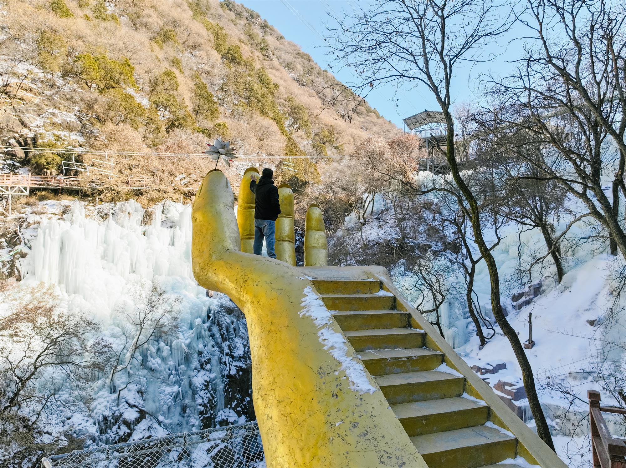 镜头下,百米崖壁是最壮阔的取景框。冰挂如帘垂落,冰瀑倾泻而下,层层冰晶在阳光中折射出七彩光泽,连片冰柱构成的“水晶屏风”与披雪苍松相映,每一帧都是自然雕琢的冰雕艺术品。网红佛手打卡点、透明礼物球与白雪公主雕塑相映成趣,成为亲子摄影的热门选择。